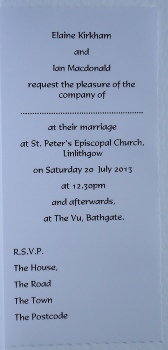 Wedding and evening invitations, RSVP, order of service,wedding menu and place name cards are all included. Keep watching for new photos!